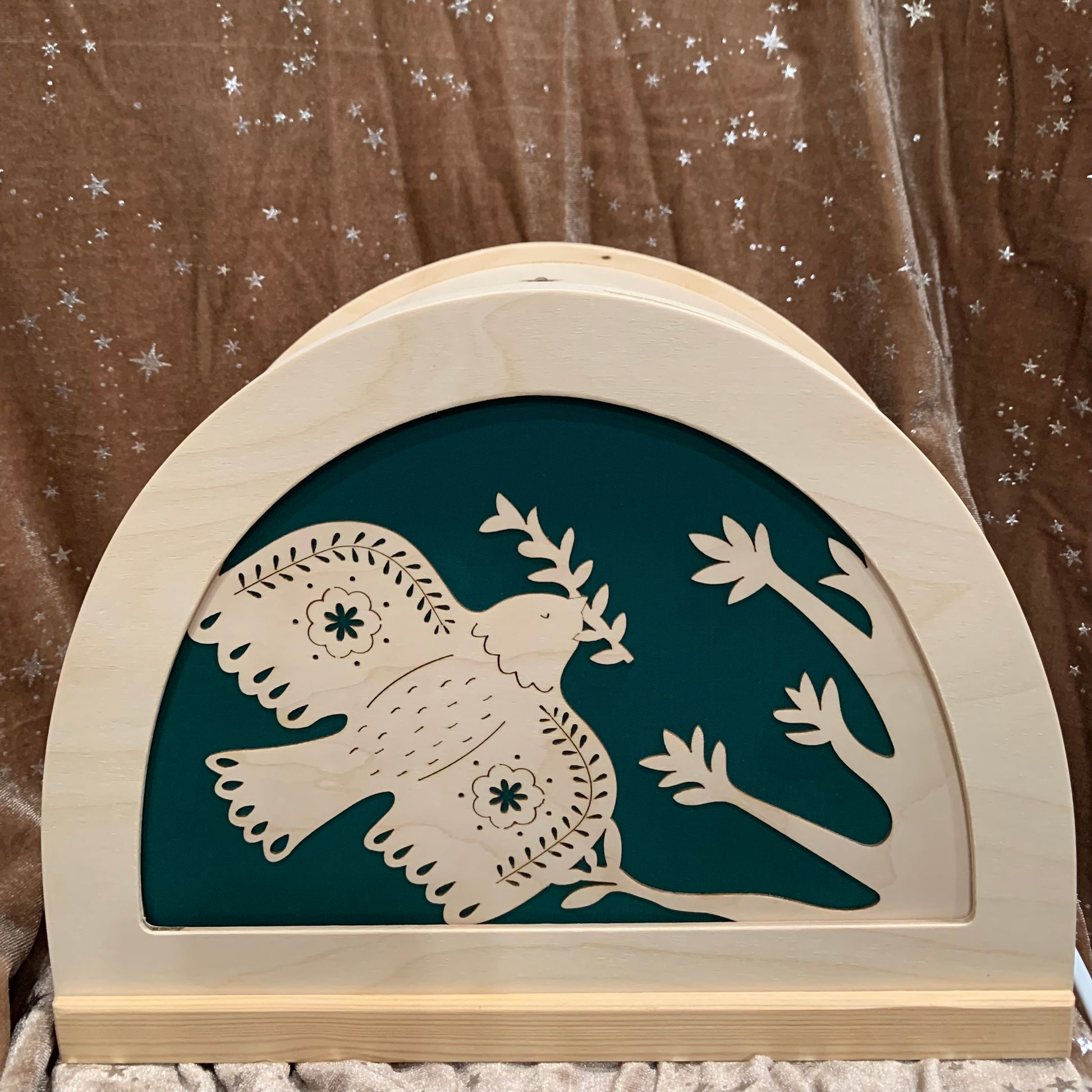 The classic De Noest lamp is versatile with up to around 30 screens to choose from. The silhouette is cut from sustainable birch, lined with a coloured fabric, and backed with a non flammable opaque screen which creates a beautiful glow, outlining the silhouette.