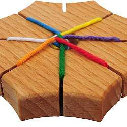 The braiding star is 8.5 cm accross and 1.5 cm thick. Comes with a rainbow of shades of yarn mto get started making your own braids. From 4 years, develops fine motor skills, and perseverance.