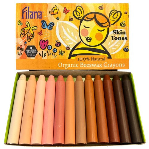 The 'skin colour' series of beautiful organic beeswax crayons by Filana is available in both blocks and sticks, in a card box of either 8 or 12 subtle skin tones reflecting the diversity of humanity.