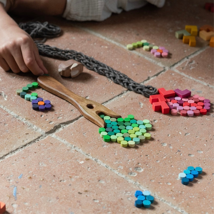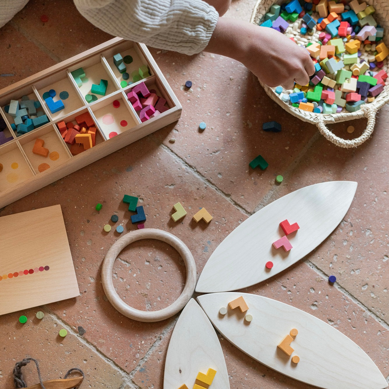 Mis Match Bloom adds to the creative Mis Match play, adding a new dimension with 400+ small wooden shapes: 10mm dots, and 20mm x 20mm 'L' shapes in 36 gradients of colour.